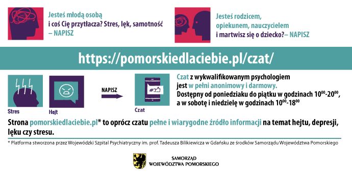 Coraz więcej młodych ludzie boryka się z trudnościami w szkole, relacjach z rówieśnikami i rodzicami, lękami, depresją czy hejtem w Internecie. Potrzebują wsparcia, ale nie zawsze wiedzą, gdzie się zwrócić. Pomoc może być na wyciągnięcie ręki – wystarczy skorzystać z czatu ze specjalistą dostępnego na stronie pomorskiedlaciebie.pl. Rozmowy mogą trwać nawet godzinami, a ich celem jest konkretne wsparcie.